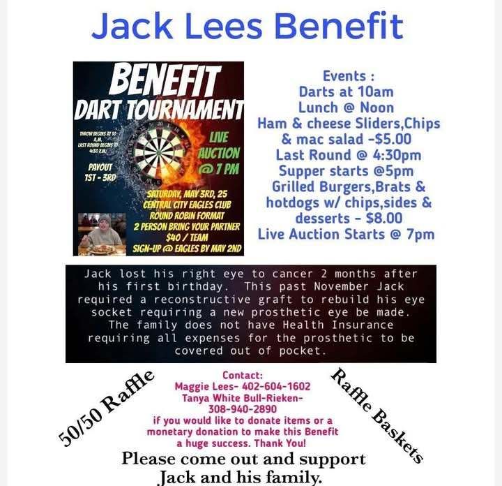 Webb Plaza’s Island Billiard’s and Dart’s will be supporting a dart tournament and auction benefit for Jack Lees at the Central City Eagles Club this Saturday, May 3rd, 2025. The benefit will include a dart tournament, a live auction, and raffle baskets, along with lunch and dinner options. The event is intended to raise funds for Jack Lees’s reconstructive surgery to his eye after his battle with cancer.